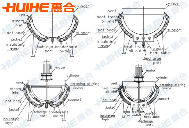 Vertical jacketed kettle alternate name is vertical steam kettle, vertical steam cooking kettle, vertical steam jacketed kettle, mainly composed of pot and tilting frame, usually suitable for liquid materials.