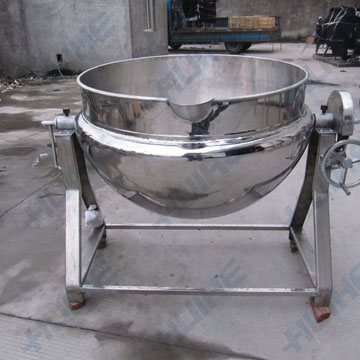 燃氣夾層鍋:就是人工打開氣閥,點燃燃氣,加入食用油,待油溫達到烹飪溫度時,加入適量的物料,人工翻鍋、攪拌,使物料在鍋里均勻受熱。待物料加工完畢后,關氣熄火,轉動手柄,通過蝸輪、蝸桿傳動裝置,使鍋體旋轉傾斜,將物料倒入另一容器內。