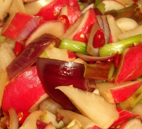 食材:心里美蘿卜150g、萵筍150g、櫻桃蘿卜100g、胡蘿卜80g、紅辣椒40g、芹菜100g、生姜15g、八角1個(gè)、鹽1小勺、花椒1小勺、桂皮2g、香葉1片